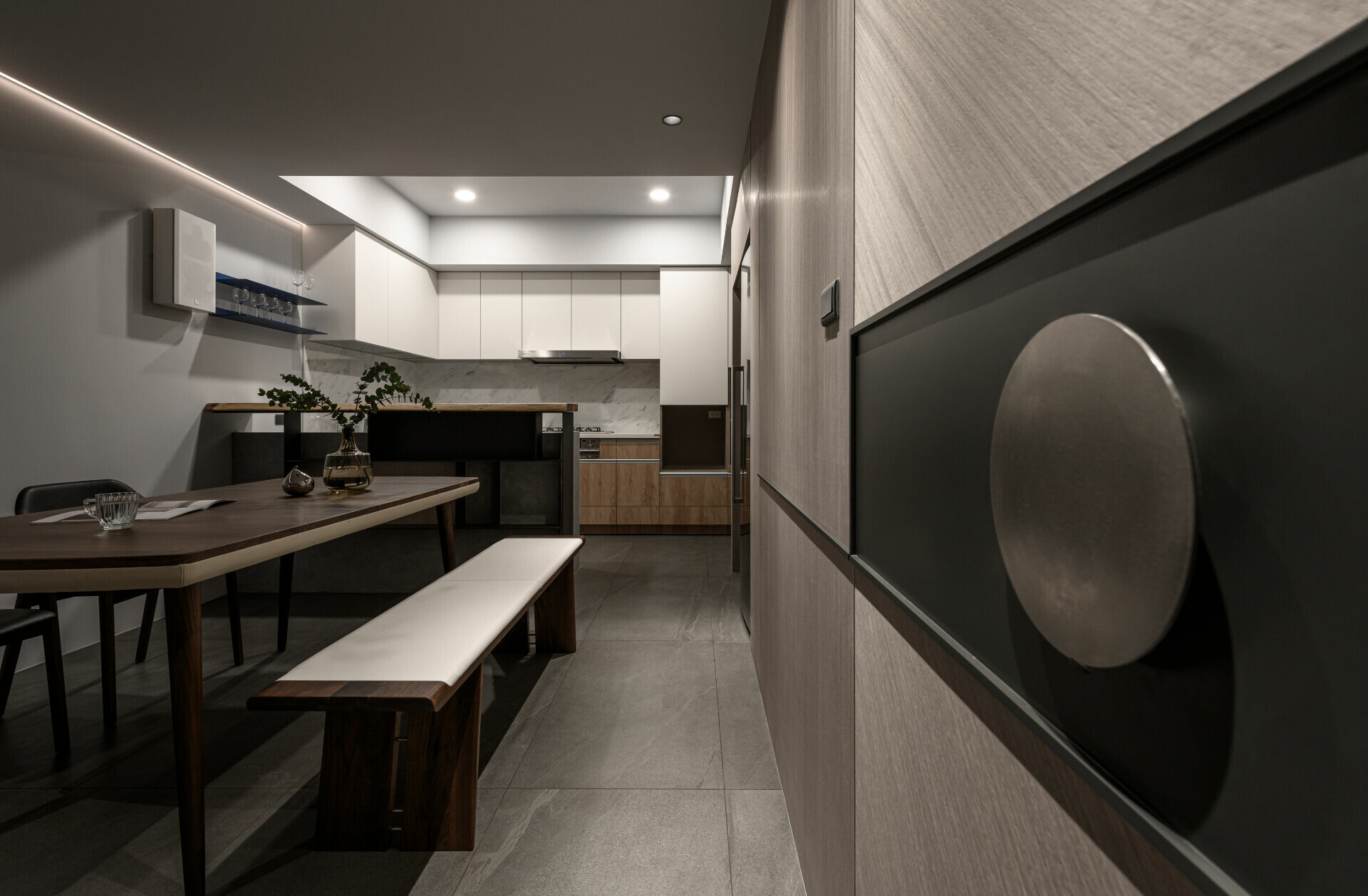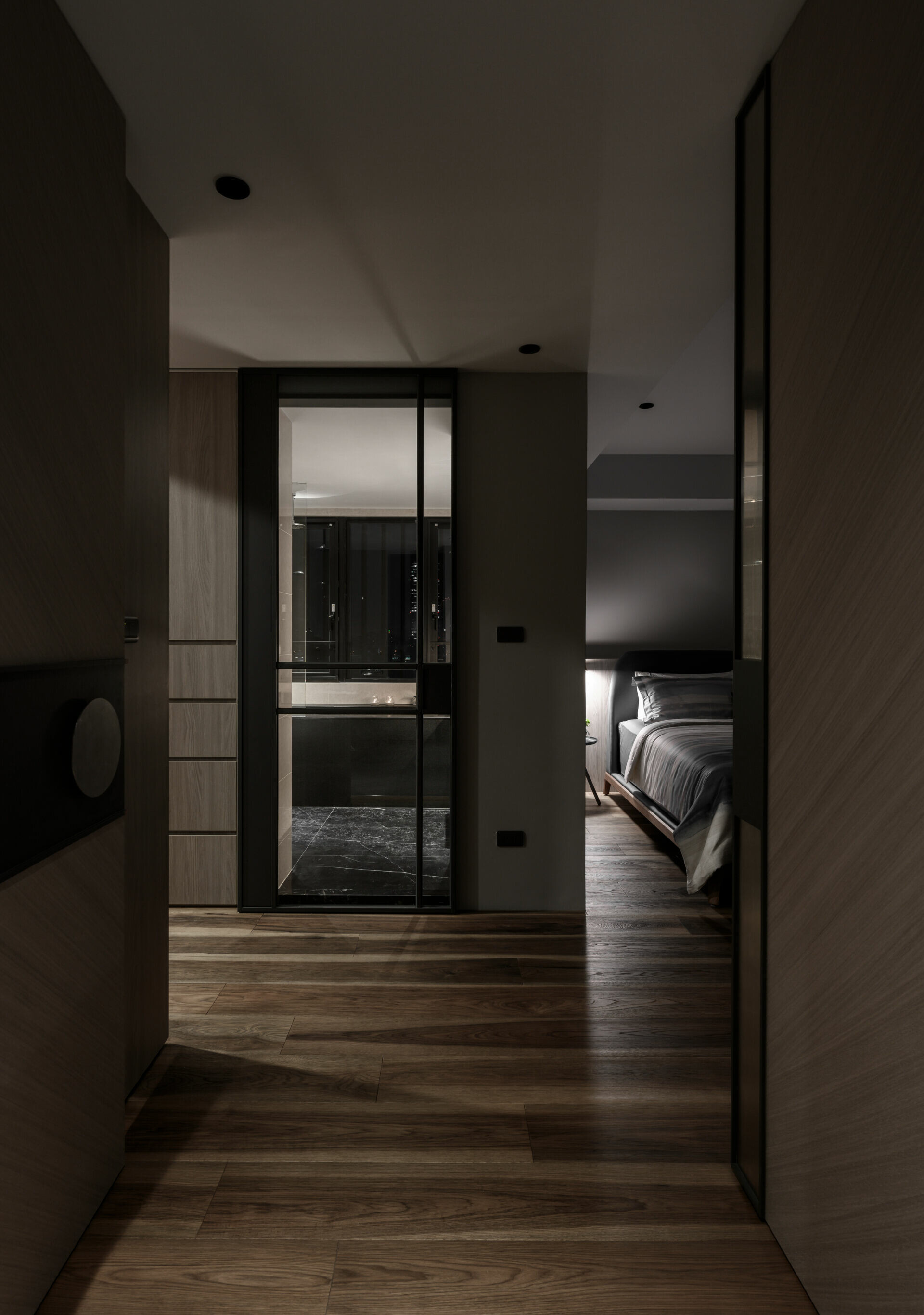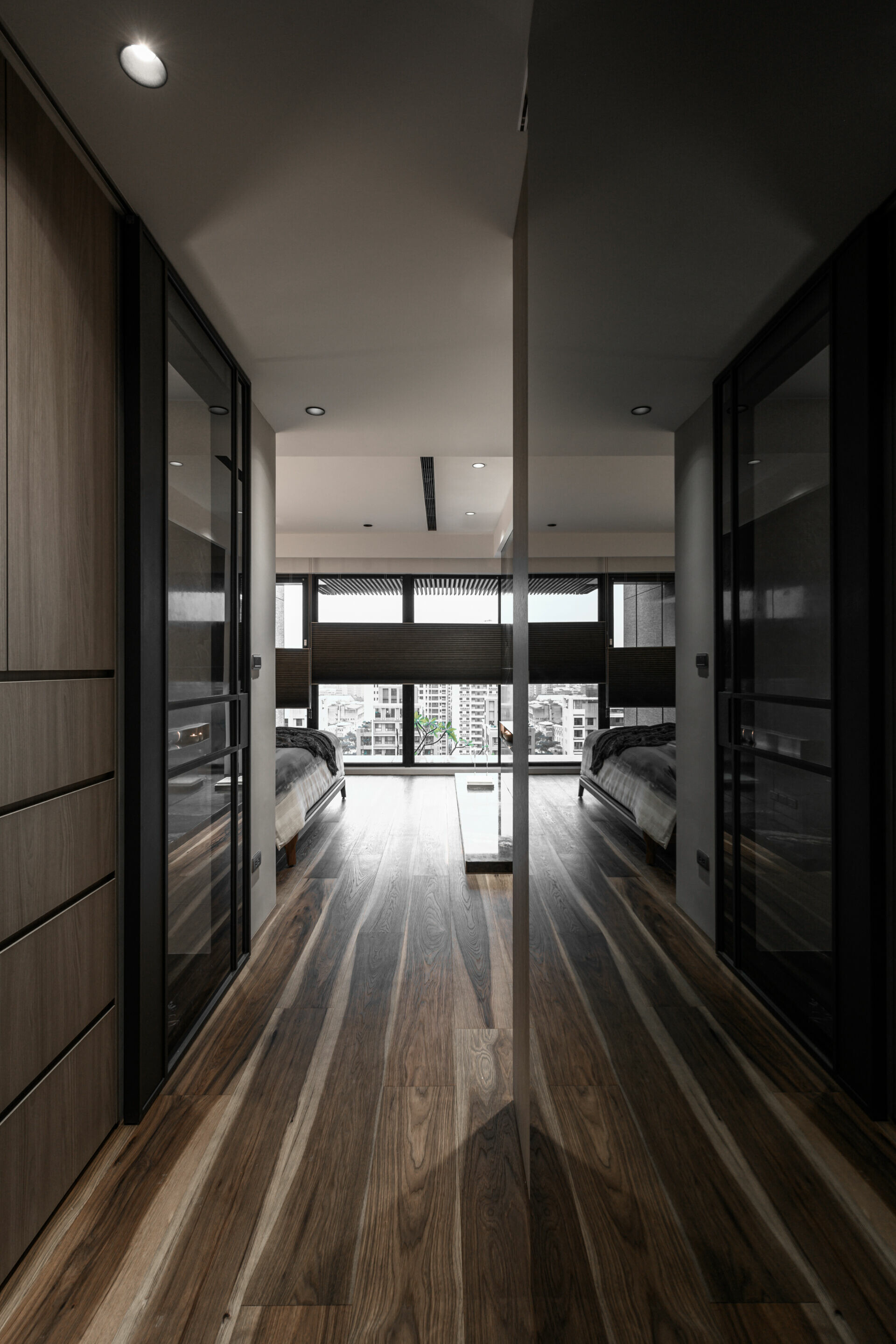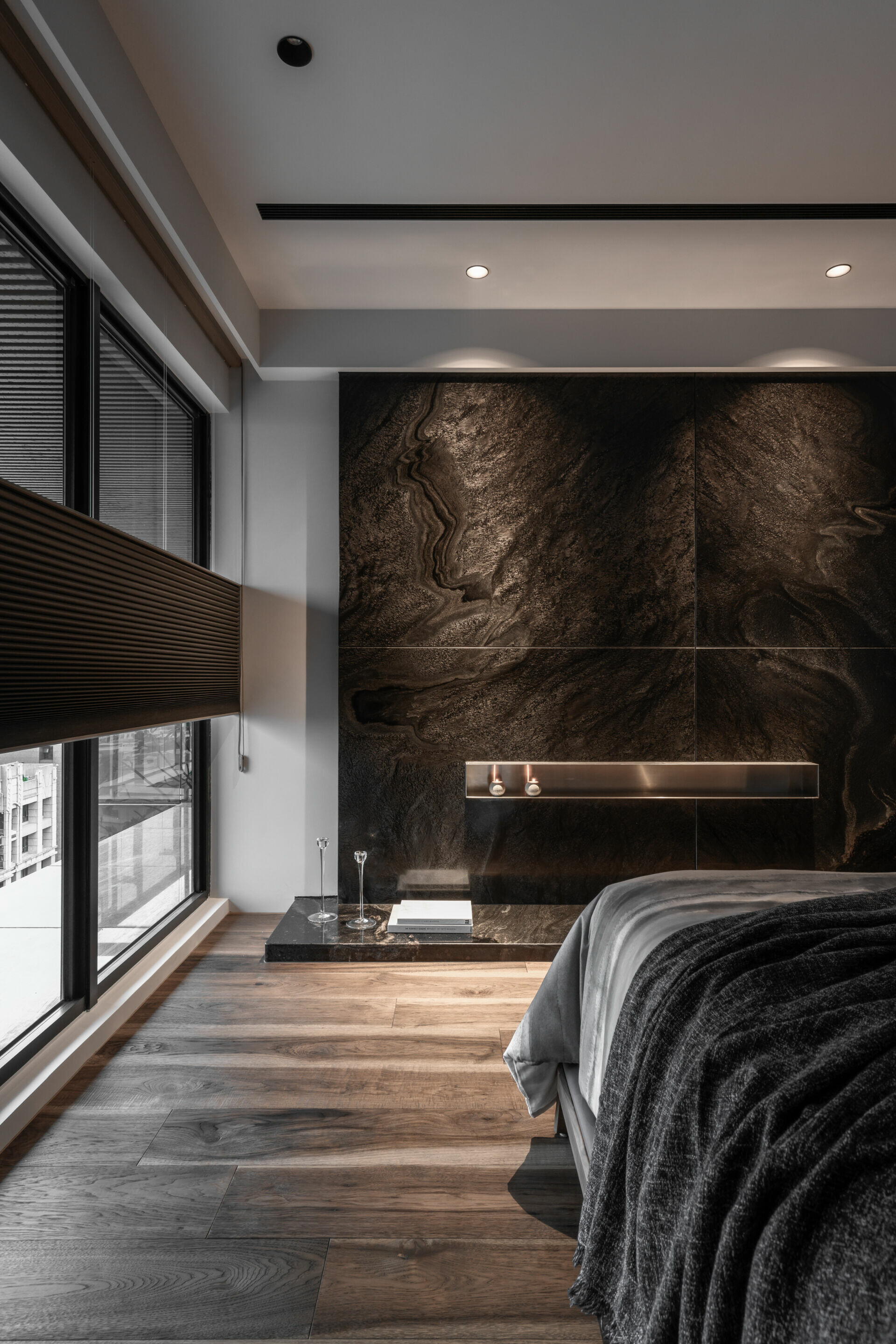 並在細節處利用各種灰階面材及造型元素展現出不對稱的變化巧思,