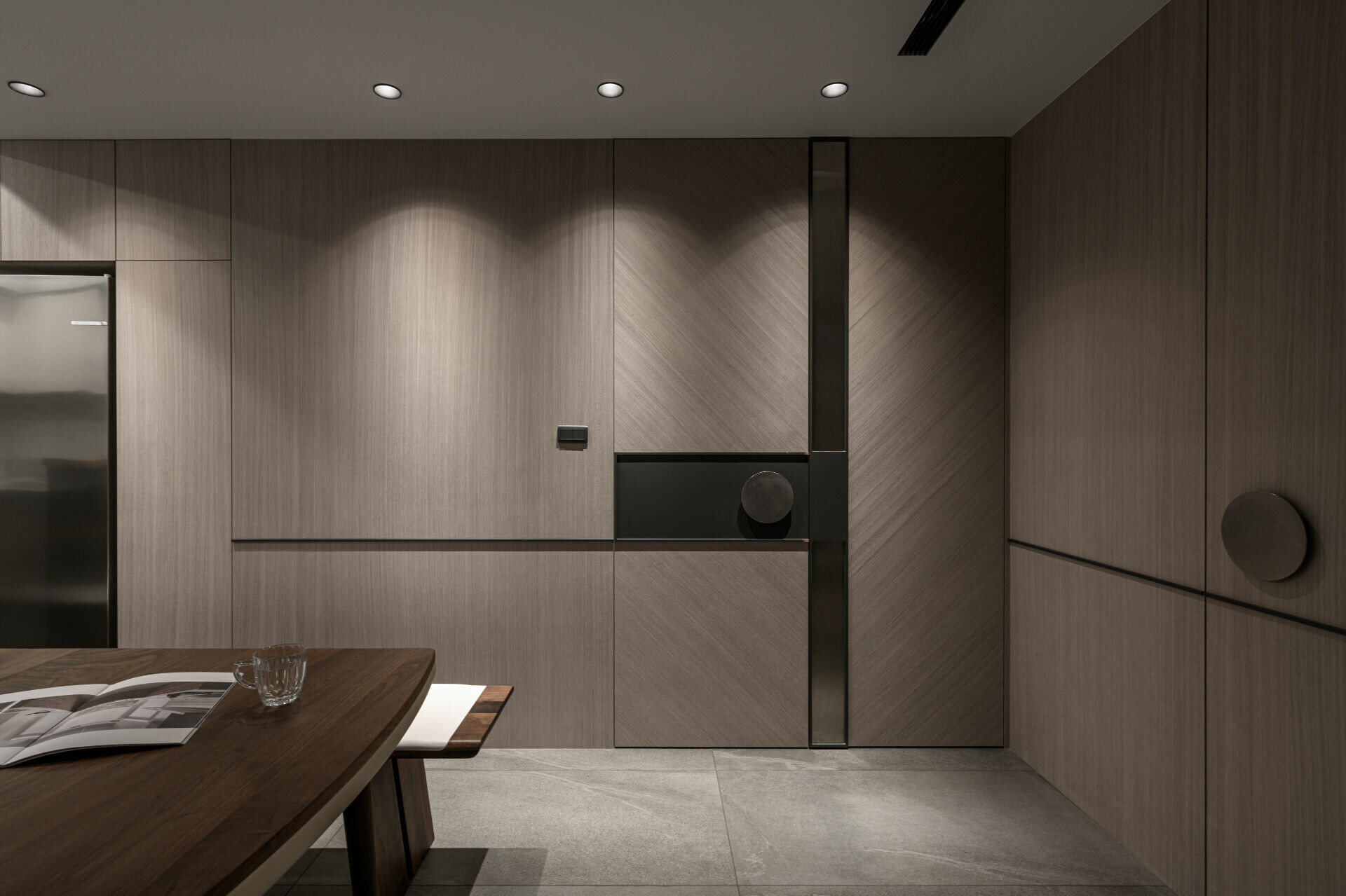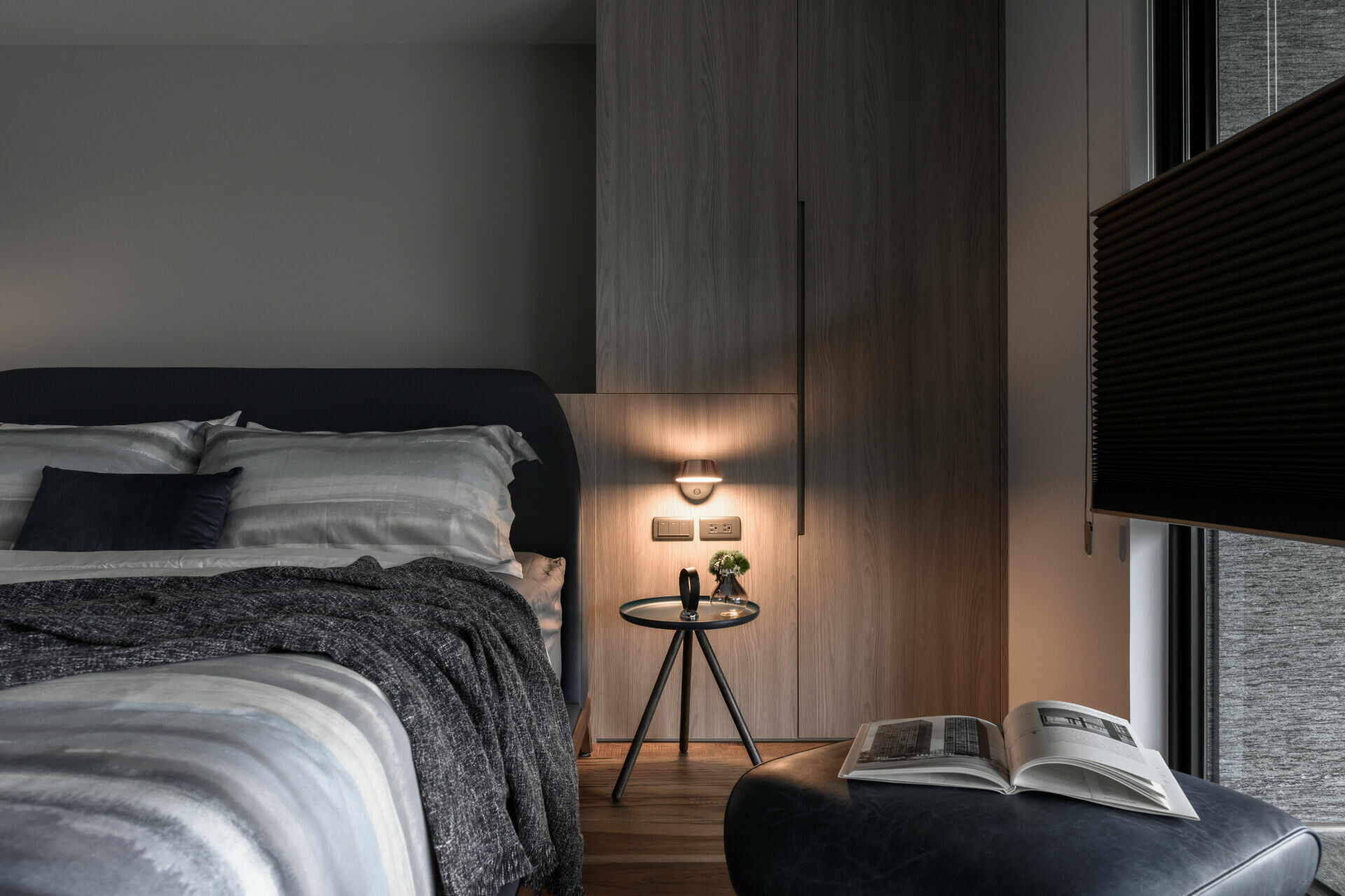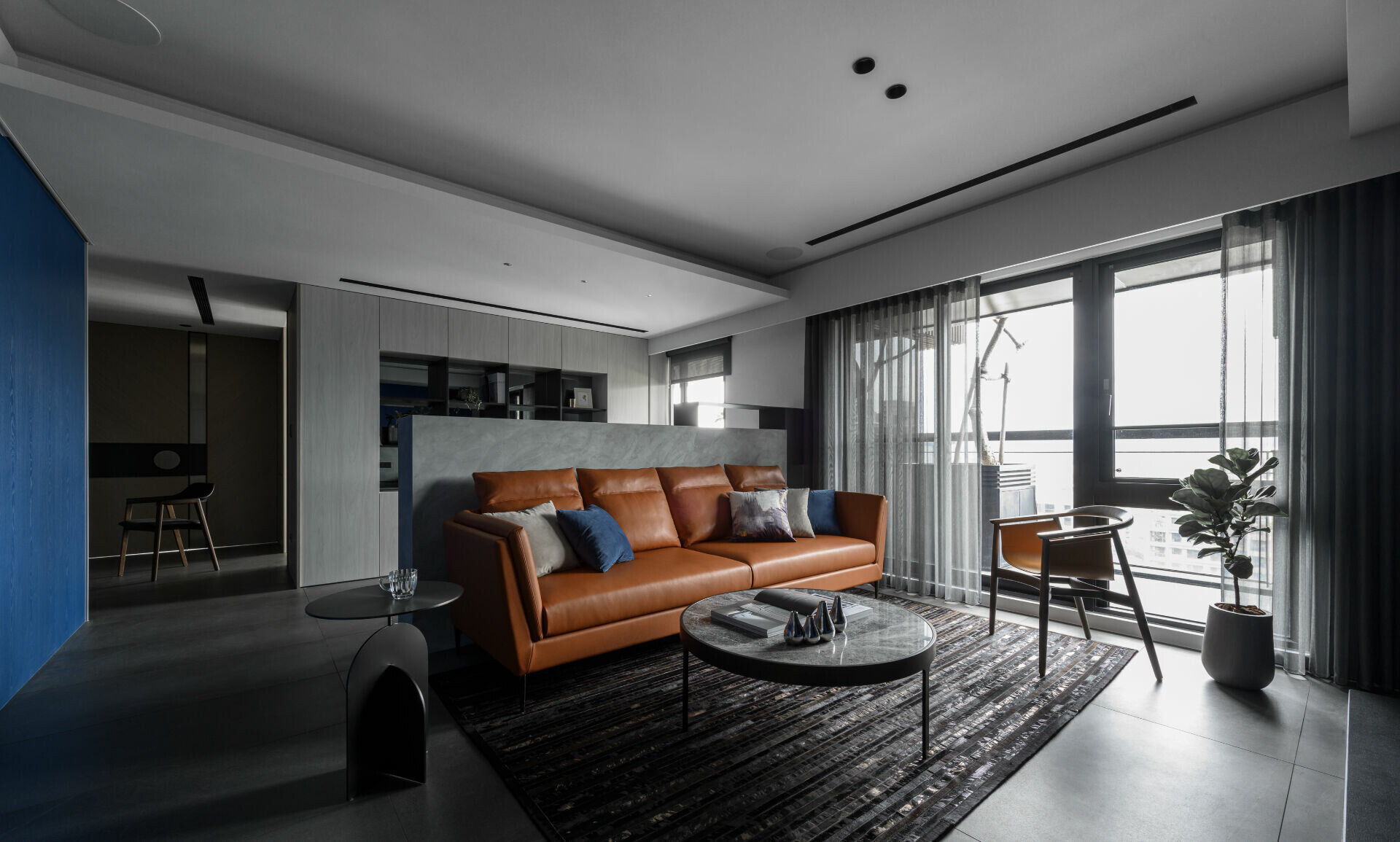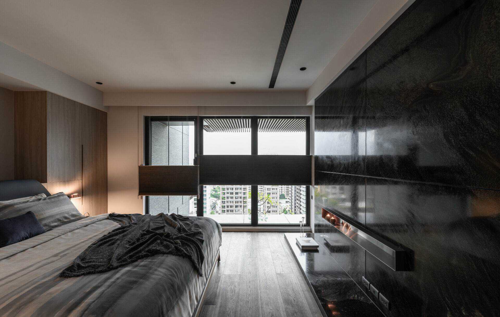 並在細節處利用各種灰階面材及造型元素展現出不對稱的變化巧思,