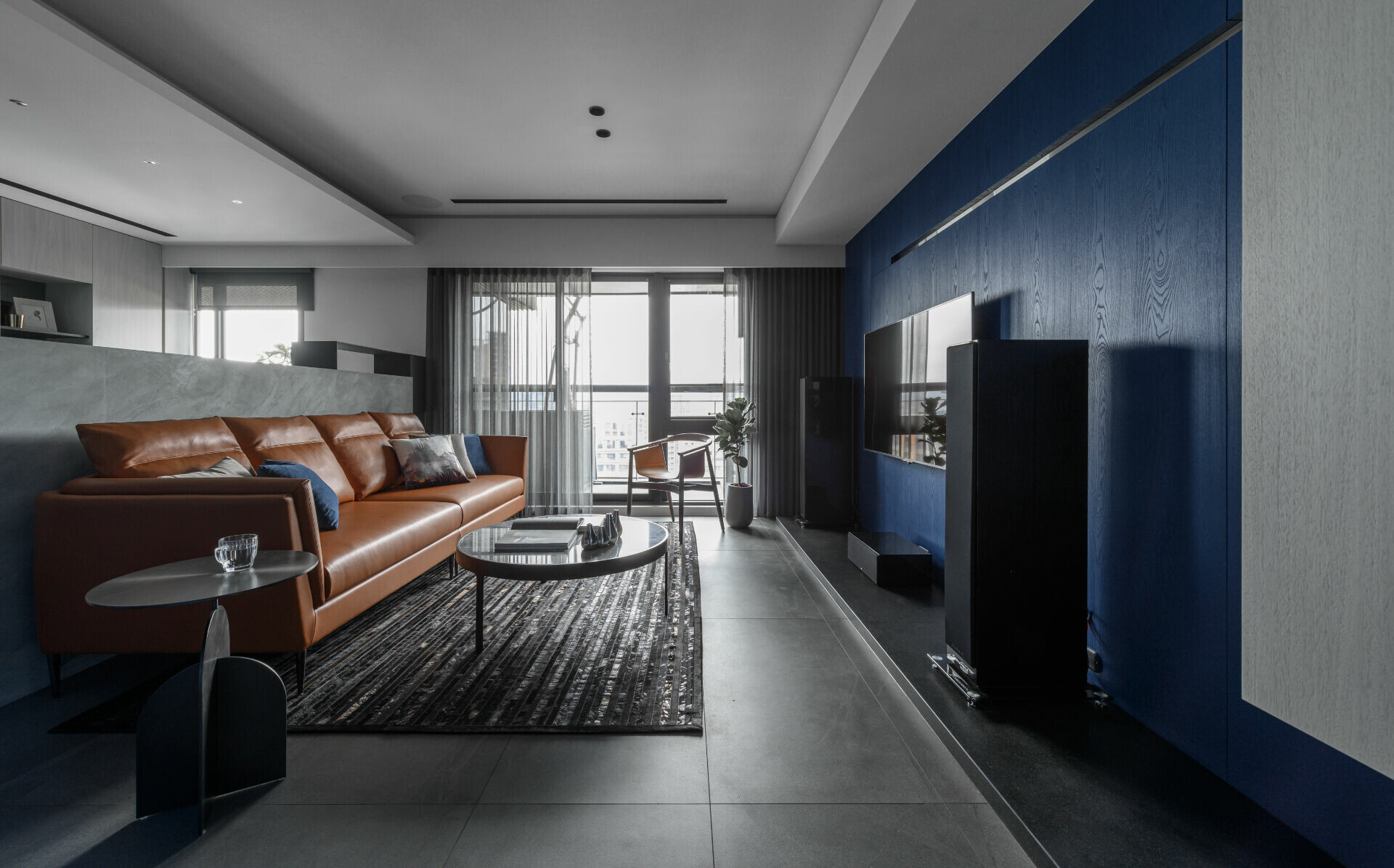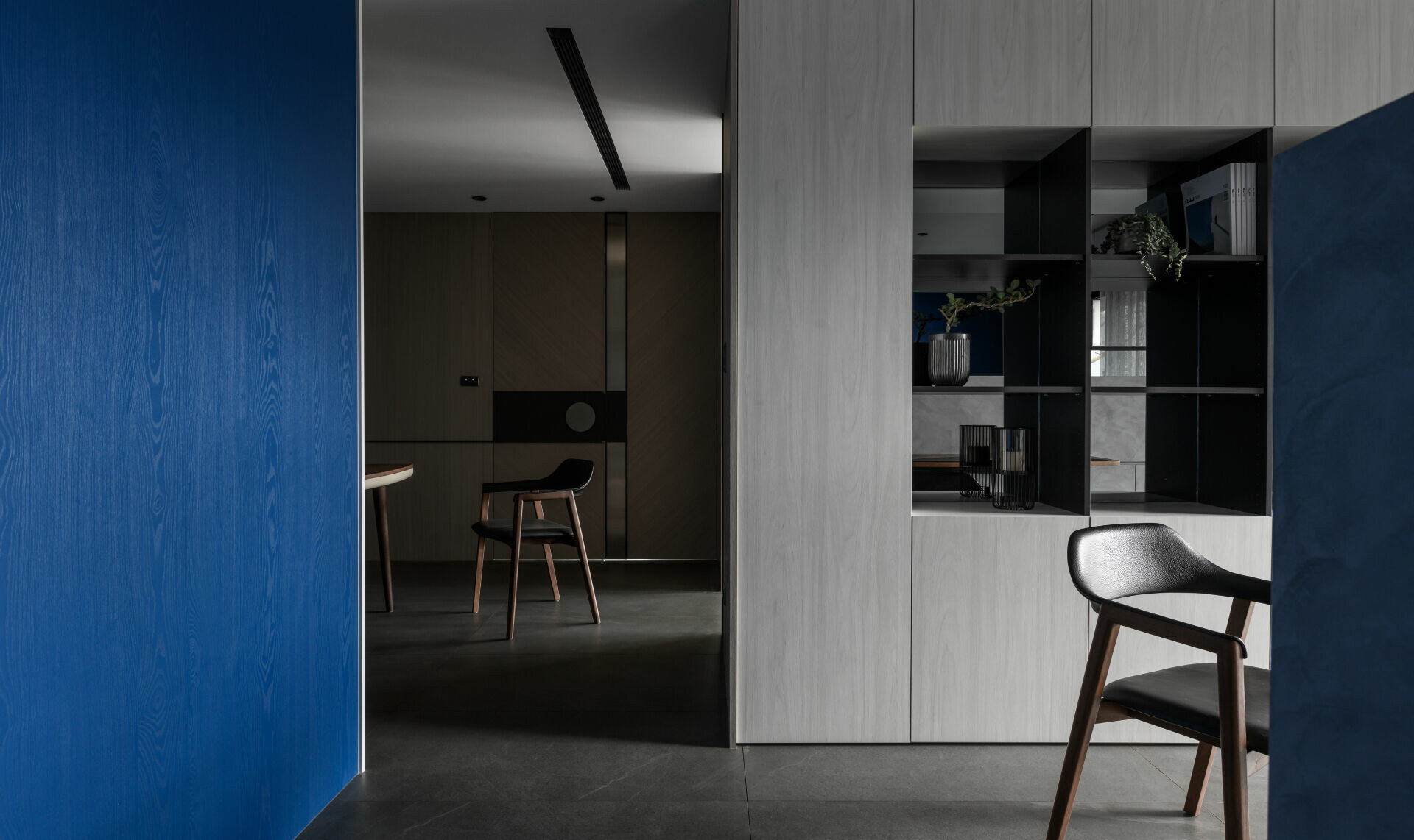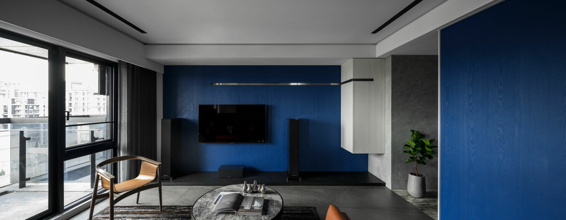 考慮到長久置身住宅應有的安定感受,設計上先以視覺感強烈的深藍構成視覺焦點,