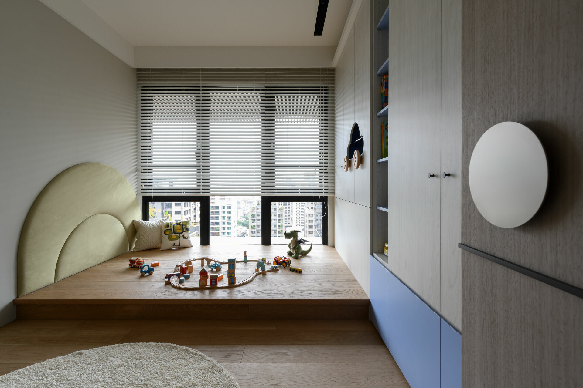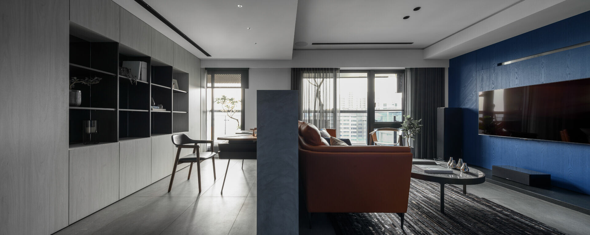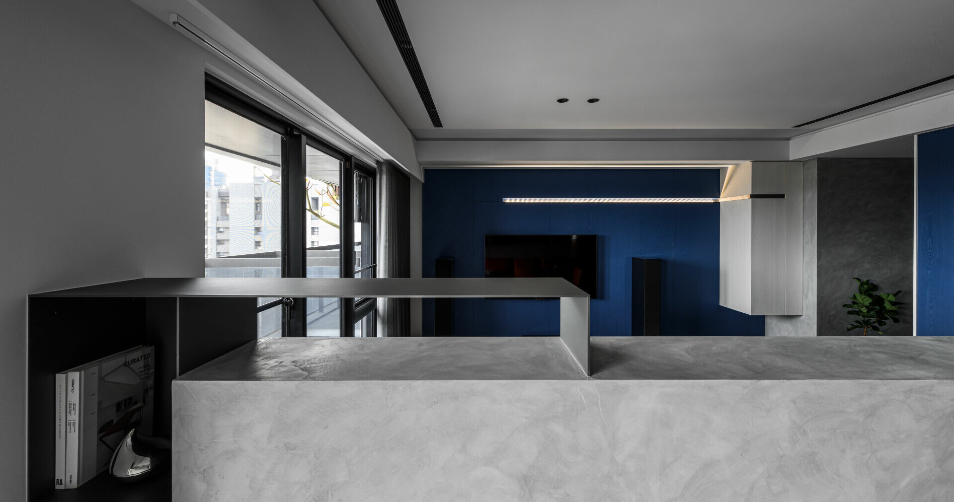 考慮到長久置身住宅應有的安定感受,設計上先以視覺感強烈的深藍構成視覺焦點,
